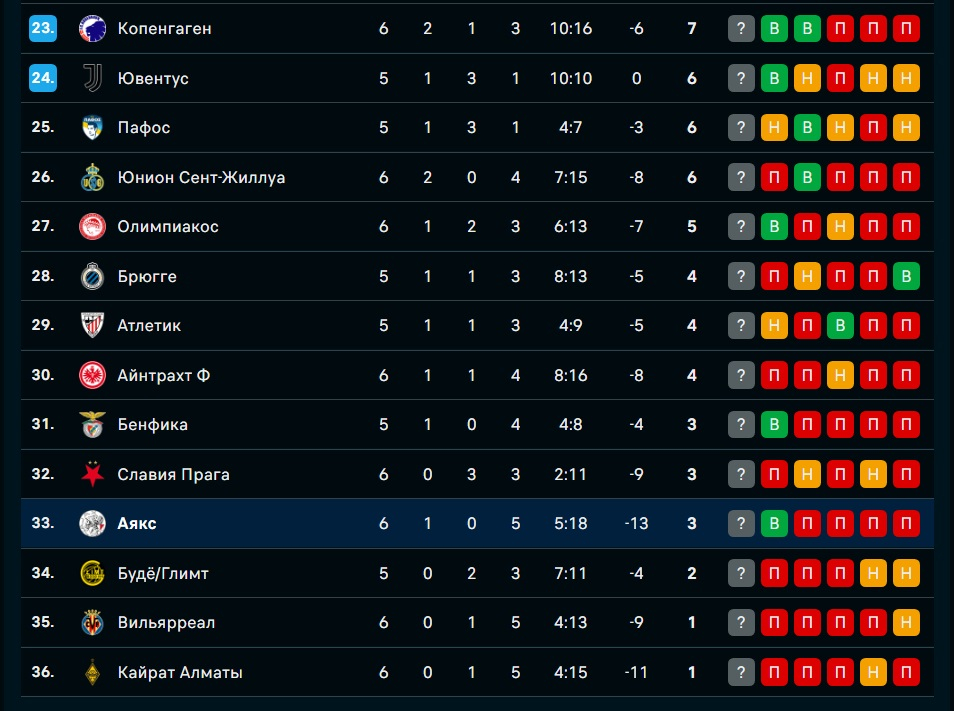 "Аякс" обгоняет "Кайрат" и становится 33-м. "Кайрат" опускается на 36-е место, имея 1 очко (ничья с "Пафосом"), столько же у "Вильярреала", но испанцы выше по разнице мячей.
