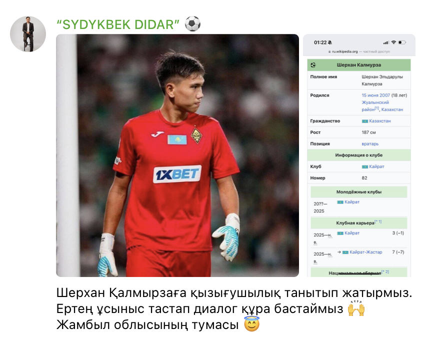 Мы проявляем интерес к Шерхану Калмурзе. Завтра сделаем предложение и начнём вести диалог. Он родом из Жамбылской области, - написал функционер.