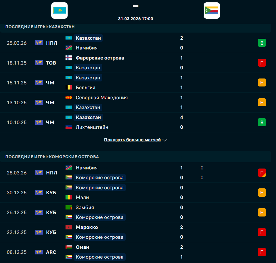 В пяти последних матчах Казахстан выиграл дважды, два раза сыграл вничью и один раз проиграл. У Коморских островов две ничьи и три поражения. Лидирует в группе Казахстан, который набрал три очка и для победы ему достаточно не проиграть в основное время. В первом матче казахстанцы обыграли Намибию со счетом 2:0. Следом Коморские острова проиграли в серии пенальти Намибии.