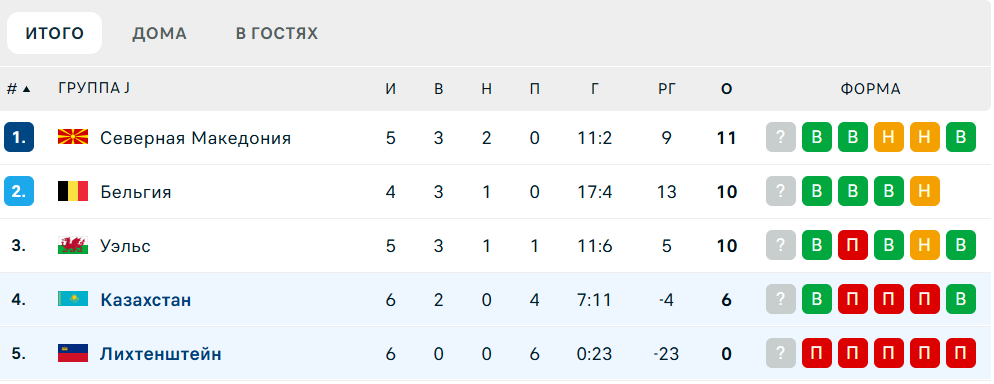 🌍 В шести матчах отбора на ЧМ-2026 Казахстан набрал шесть очков и идет на предпоследнем, четвертом, месте в группе. Следующий матч - 13 октября в 23:45 против Северной Македонии в Скопье