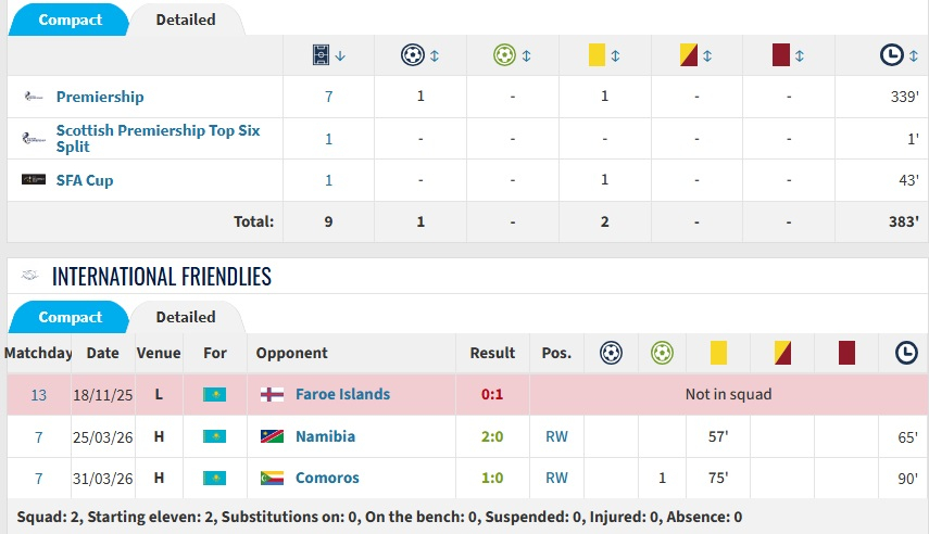 У Чеснокова 383 минуты в 9 играх за "Хартс" с момента перехода в январе. При этом в мартовских матчах за сборную Казахстана он отыграл полным матч с Коморами и 65 минут с Намибией.
