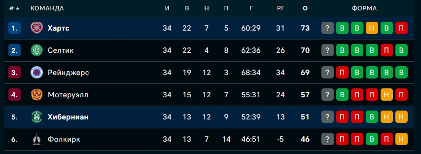 "Хартс" занял первое место по итогам начального этапа. После победы над "Хибернианом" у команды еще четыре матча. Преимущество над идущим вторым "Селтиком" - 3 очка.