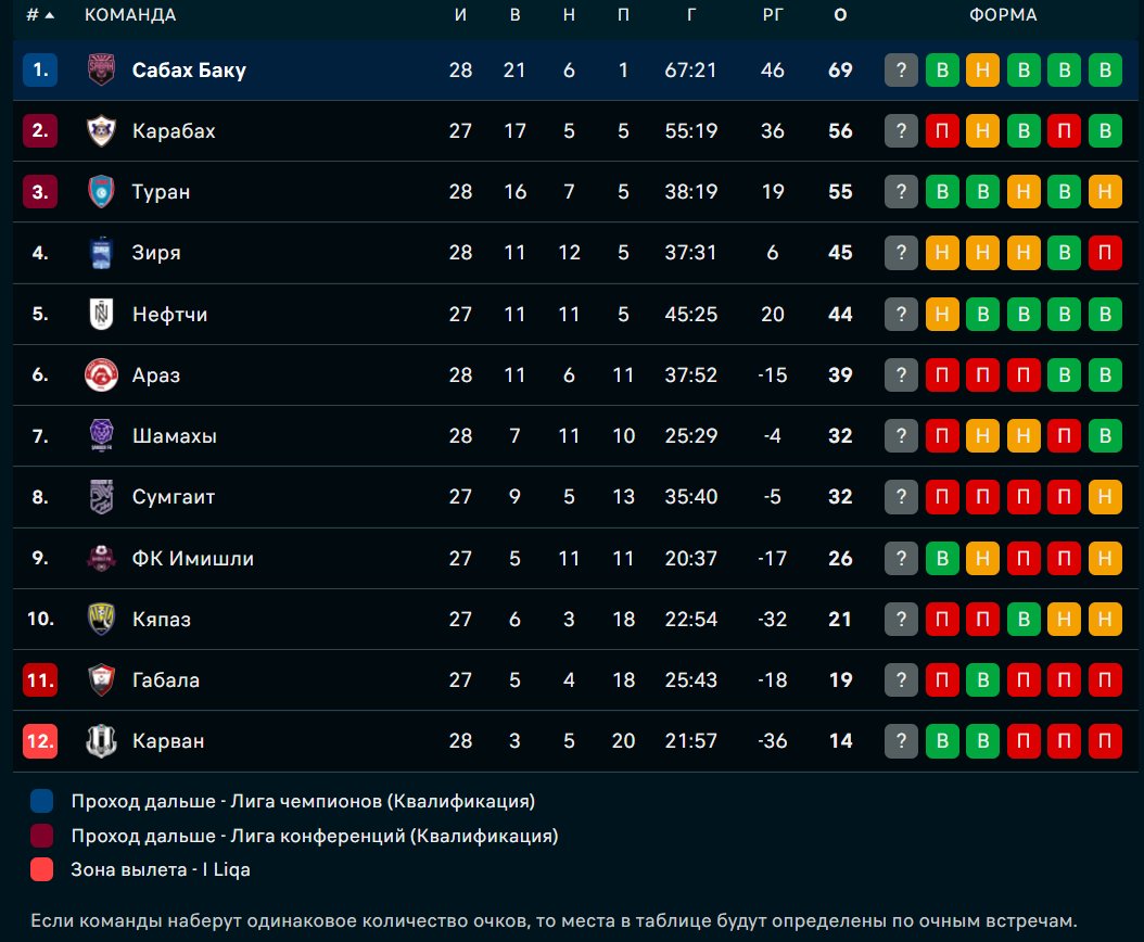 У "Сабаха" сейчас 69 очков. Разрыв между командами составляет 13 очков. При этом у "Карабаха" есть одна игра в запасе, что дает им теоретическую возможность набрать максимум 18 очков (итого 74).