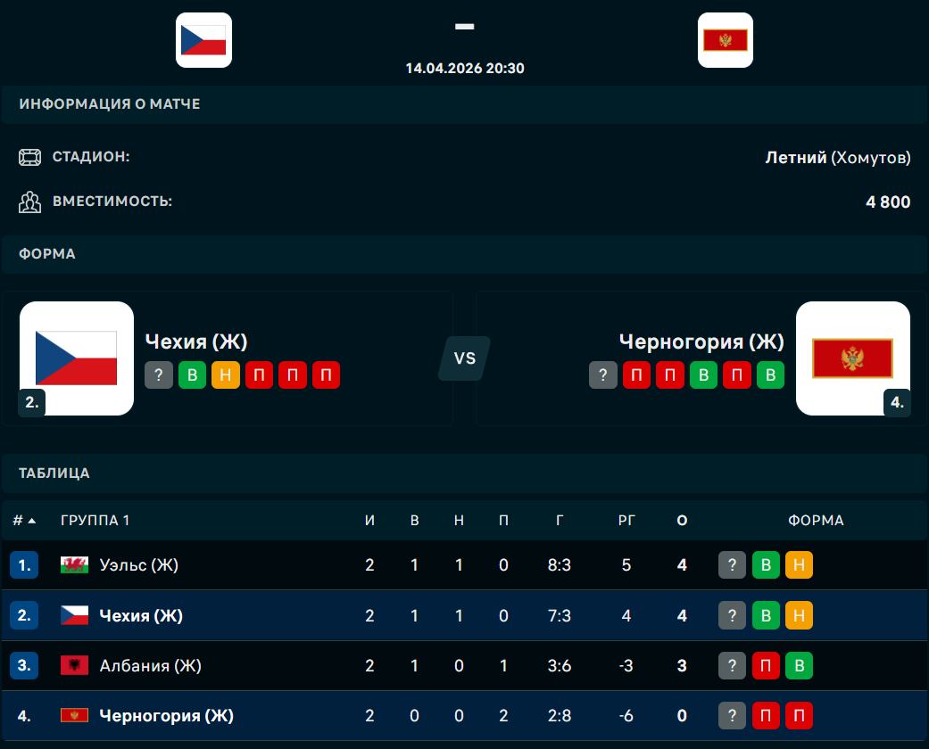 Турнирное положение перед матчем Чехия - Черногория в отборе на женский ЧМ