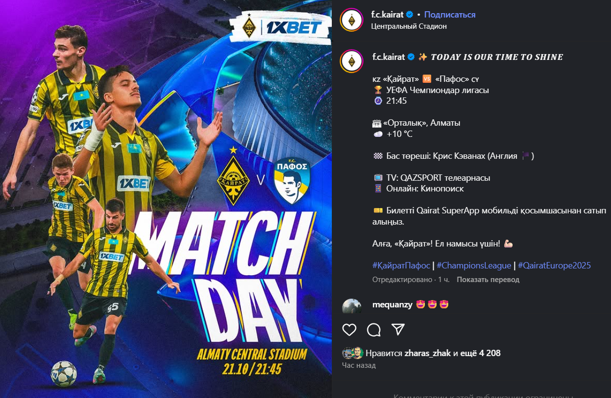 Прямая трансляция матча "Кайрат" - "Пафос" в Лиге чемпионов