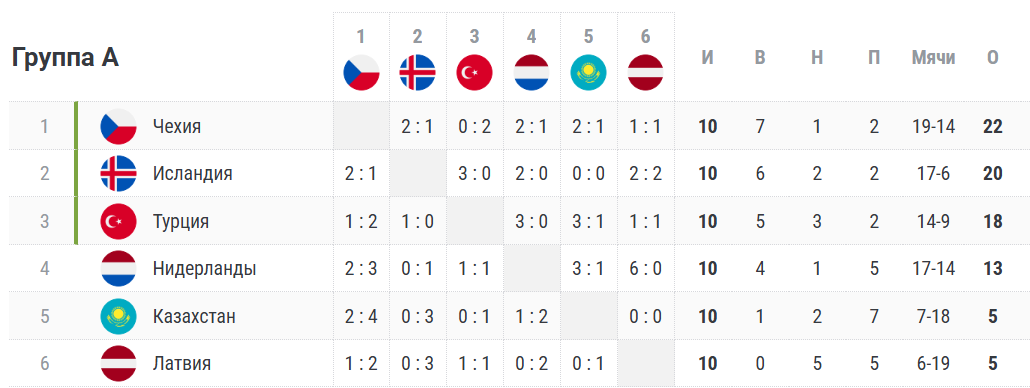 В итоге Турция вырвала домашнюю победу над Исландией - 1:0, на 89-й минуте забил Инан Сельчук. В параллельном матче Казахстан победил в Риге Латвию - 1:0, на 65-й минуте забил Исламбек Куат.