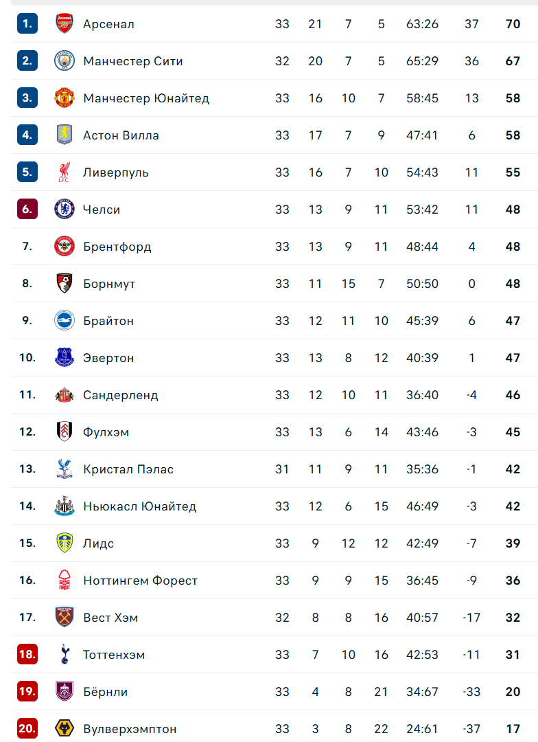 "Арсенал" шел с комфортным отрывом в 9 очков после 31-го тура, но 11 апреля неожиданно проиграл "Борнмуту" (1:2) с 13-го места. Так у команды Микеля Артеты прервалась серия из восьми матчей в АПЛ без поражений.