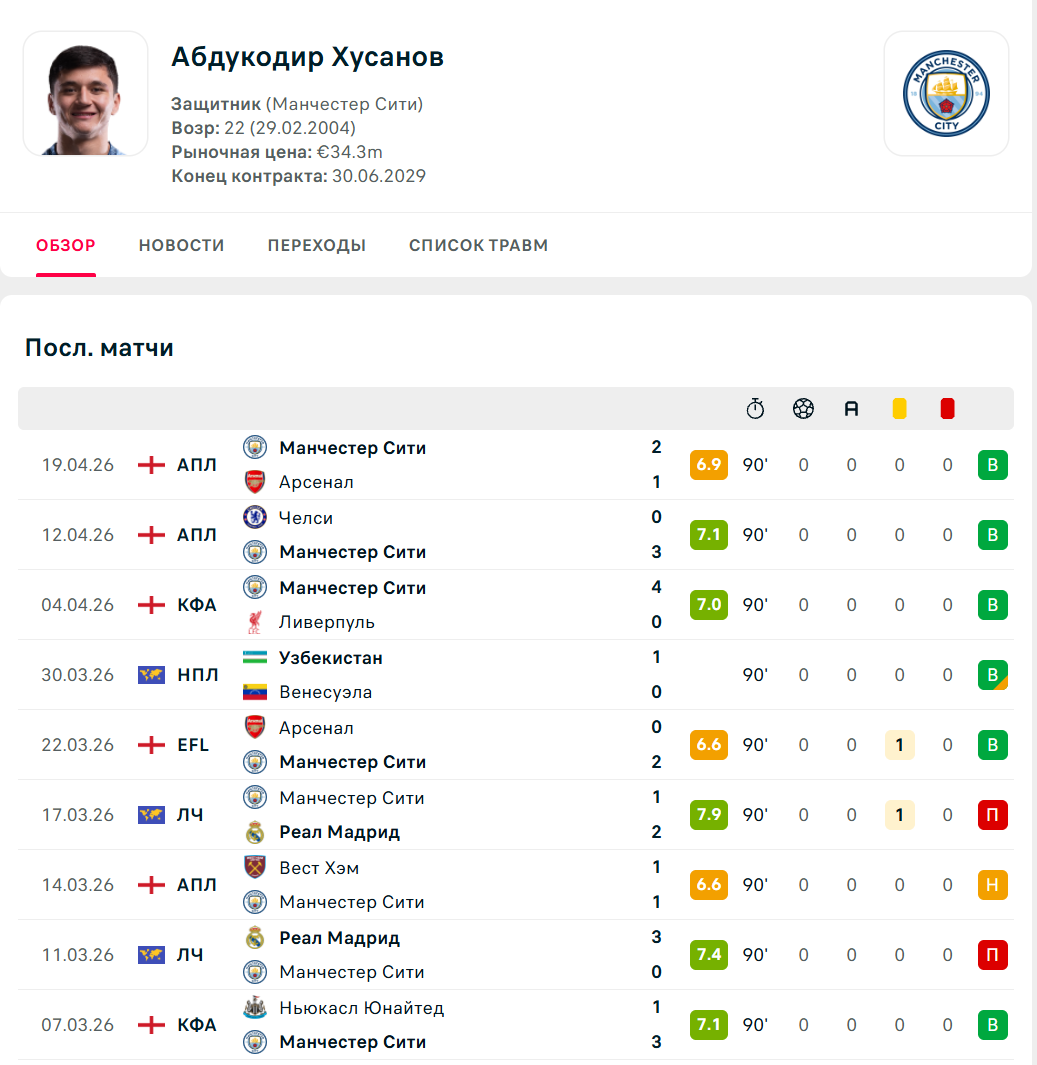 У 22-летнего Хусанова теперь 17 матчей в текущем сезоне АПЛ и 22 игры - за полтора сезона в клубе.