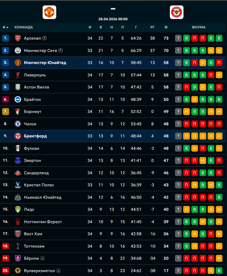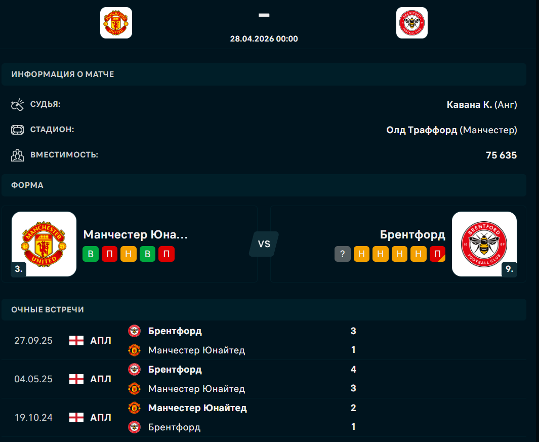 В ночь с 27 на 28 апреля состоится матч 34-го тура английской премьер-лиги, в котором "Манчестер Юнайтед" сыграет с "Брентфордом", сообщает Спорт Шредингера.