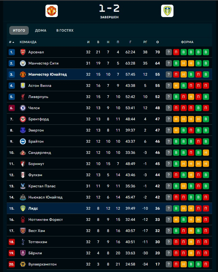 "МЮ" потерял очки во втором матче подряд, но сохранил третью позицию в таблице АПЛ. Отставание от лидирующего "Арсенала" составляет 15 очков и в ближайшем туре "МЮ" может лишиться даже математических шансов догнать лидера.