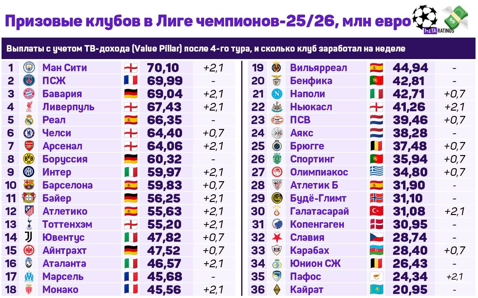 После завершения четырёх туров основного этапа Лиги чемпионов УЕФА сезона 2025/26 телеграм-канал "Кошелёк" опубликовал обновлённый рейтинг призовых с учётом выплат за ТВ-доход, сообщает Спорт Шредингера.