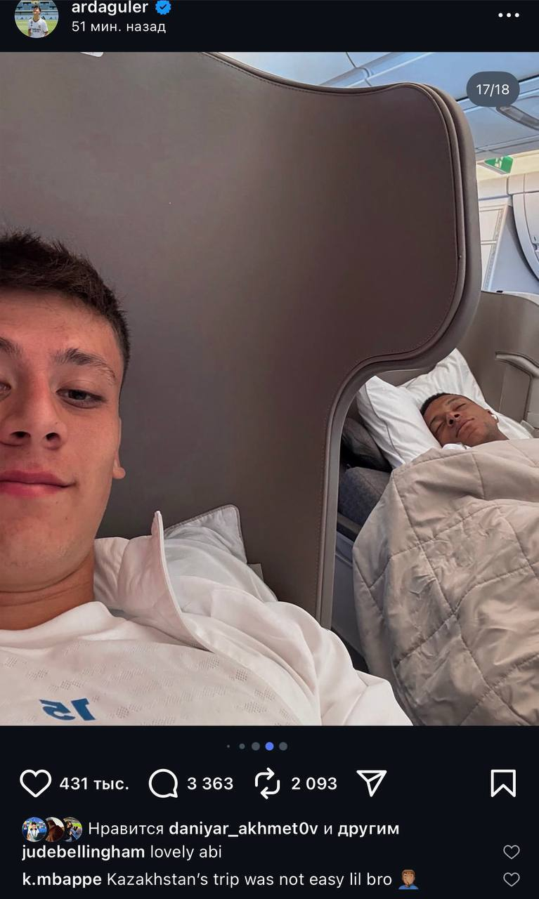 Арда загрузил в свой Instagram-аккаунт несколько фотографий из разных эпизодов своей жизни. В числе них, была и перелет из Алматы в Мадрид. На кадре, Мбаппе, высыпается после матча с "Кайратом", который прошел в рамках второго тура основного раунда Лиги чемпионов.
