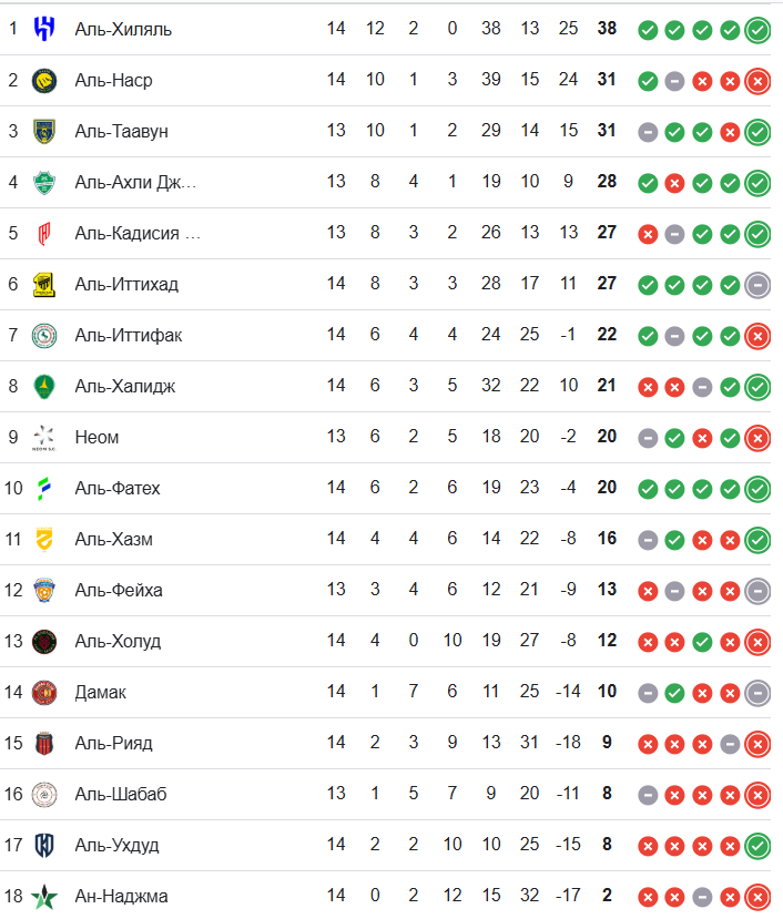 "Аль-Иттихад" занимает шестое место в чемпионате Саудовской Аравии, набрав 27 очков после 14 туров.