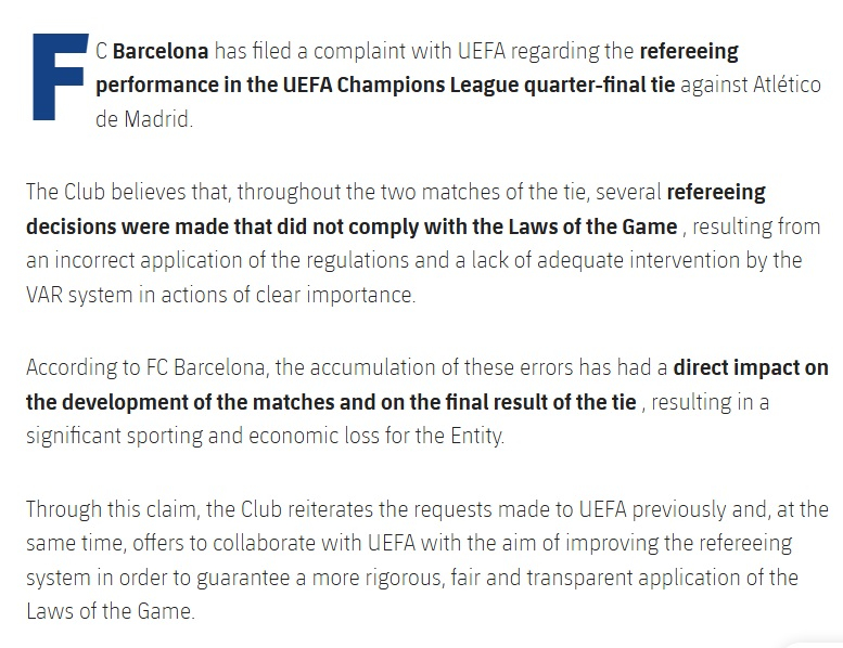 Этим заявлением клуб повторяет запросы, ранее направлявшиеся в УЕФА, и в то же время предлагает сотрудничество с УЕФА с целью совершенствования системы судейства, чтобы гарантировать более строгое, справедливое и прозрачное применение правил игры.