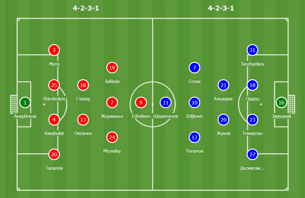 Ниже публикуются вероятные основные составы команд и их расстановка на игру. Слева "Кайрат", а справа "Актобе".