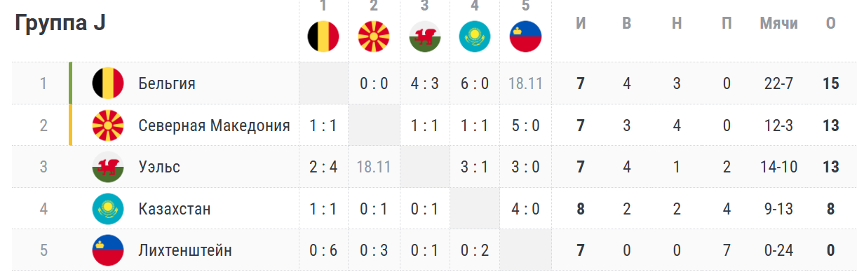 Сборная Казахстана завершила отборочный цикл на четвертой позиции в группе J – у команды 8 очков в 8 матчах (2 победы, 2 ничьи и 4 поражения). Бельгия же, с 15 очками лидирует в группе. Впереди у "красных дьяволов" матч с Лихтенштейном.