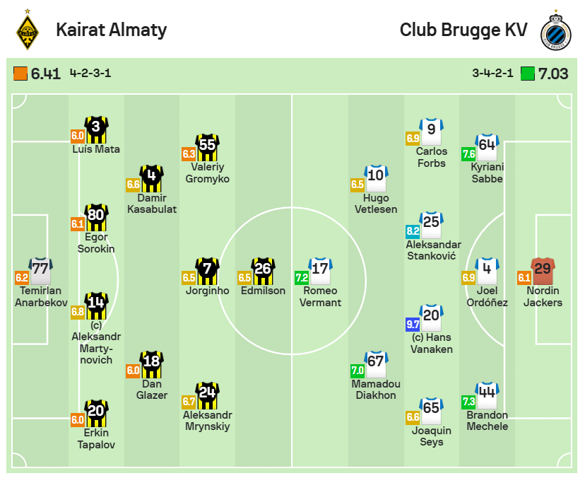 Наименьшие оценки в составе "Кайрата" получили сразу три футболиста. Защитники Еркин Тапалов и Луиш Мата, а также полузащитник Дан Глайзер завершили матч с рейтингом 6,0 балла.