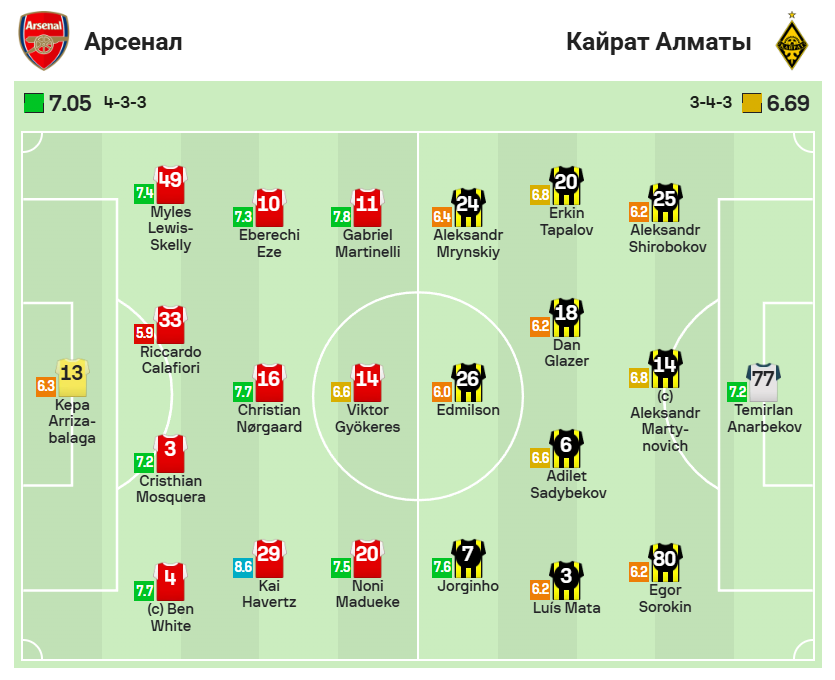 Авторитетный аналитический сайт SofaScore выставил оценки игрокам матча восьмого тура общего этапа между "Арсеналом" и "Кайратом". Встреча завершилась победой английского клуба со счетом 3:2.