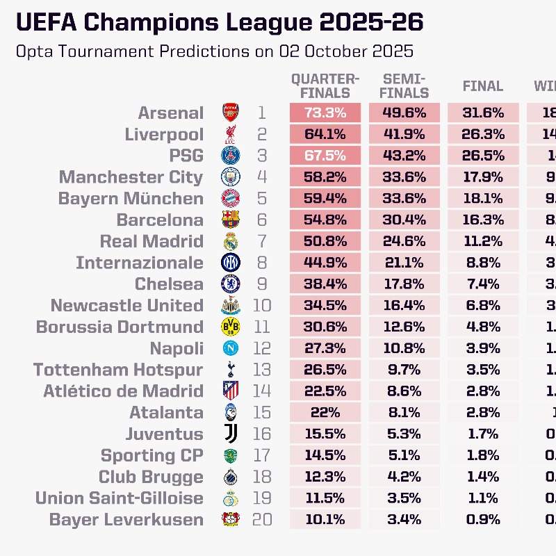 Согласно обновлённым подсчётам суперкомпьютера Opta, главным претендентом на победу в турнире в настоящий момент является "Арсенал", вероятность триумфа которого оценивается в 18,1 процента. На второй строчке располагается "Ливерпуль" (14,7%), ПСЖ - третий (14%).