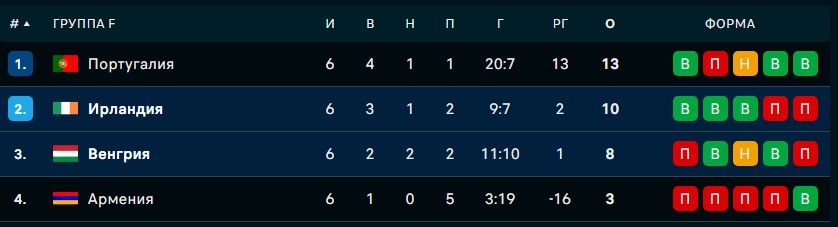 В группе F Ирландия заняла второе место, уступив Португалии 3 очка.