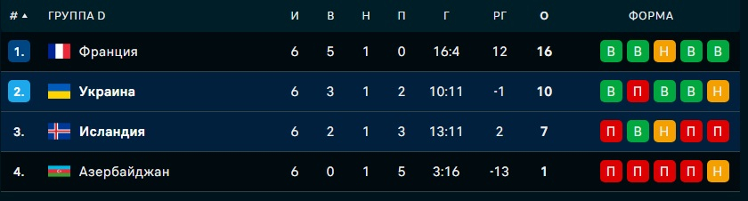Команда тренера Сергея Реброва заняла второе место в группе и теперь сыграет в стыковых матчах. Выиграли группу французы, ниже финишировали Исландия и Азербайджан.
