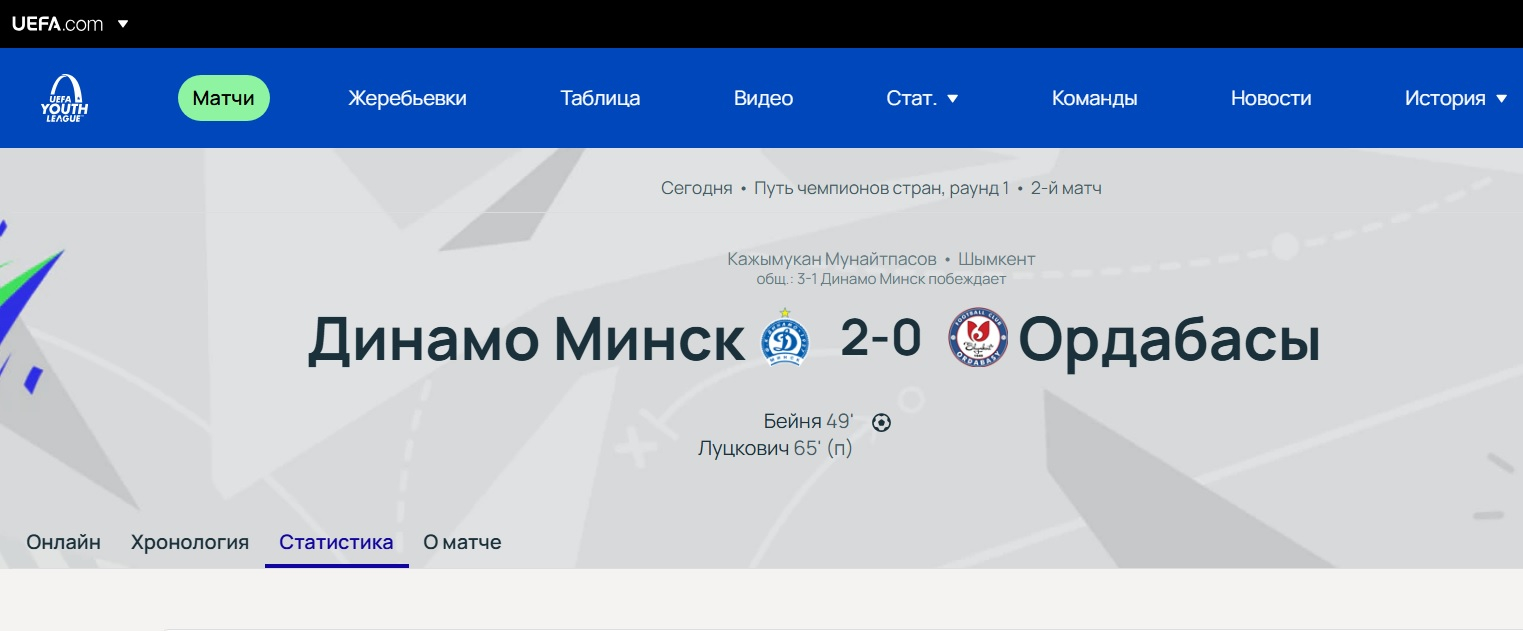 Первая встреча 26 сентября завершилась со счетом 1:1. Таким образом, по сумме двух матчей клуб из Беларуси был сильнее – 3:1. Вице-чемпион Казахстана "Ордабасы" завершил путь в Юношеской Лиге УЕФА.