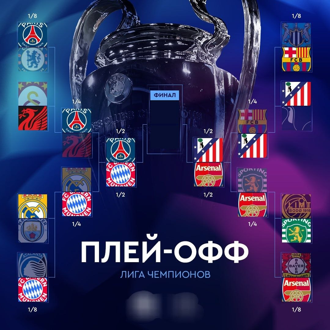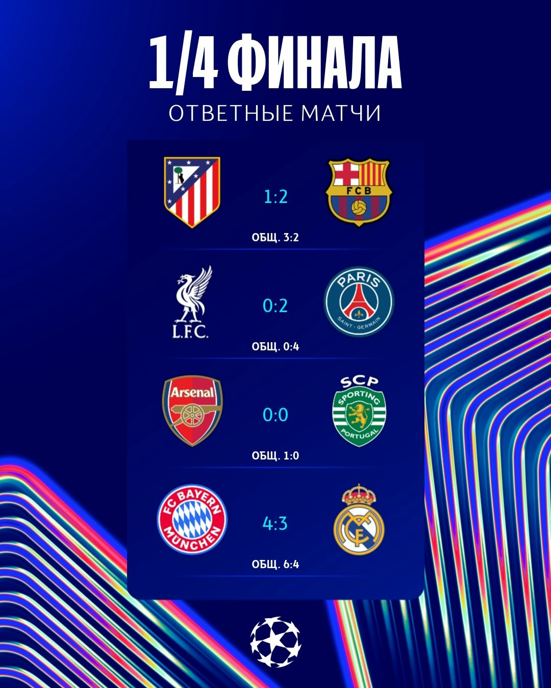 По итогам четвертьфиналов "Атлетико" вышел на "Арсенал", а ПСЖ - на "Баварию". Получается, что в полуфинале будет по одному представителю Англии, Германии, Испании и Франции.