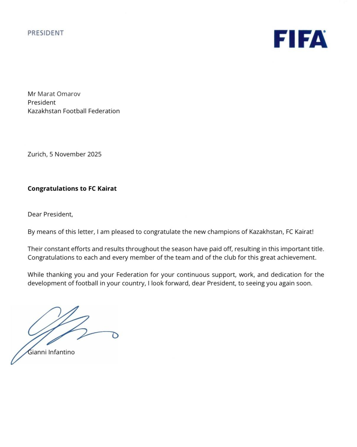 Позвольте мне посредством этого письма поздравить новых чемпионов Казахстана - футбольный клуб "Кайрат"! Их постоянные усилия и результаты на протяжении всего сезона принесли заслуженные плоды, увенчавшись этим важным титулом. Поздравляю каждого игрока команды и всех членов клуба с этим большим достижением, - говорится в письме Инфантино.