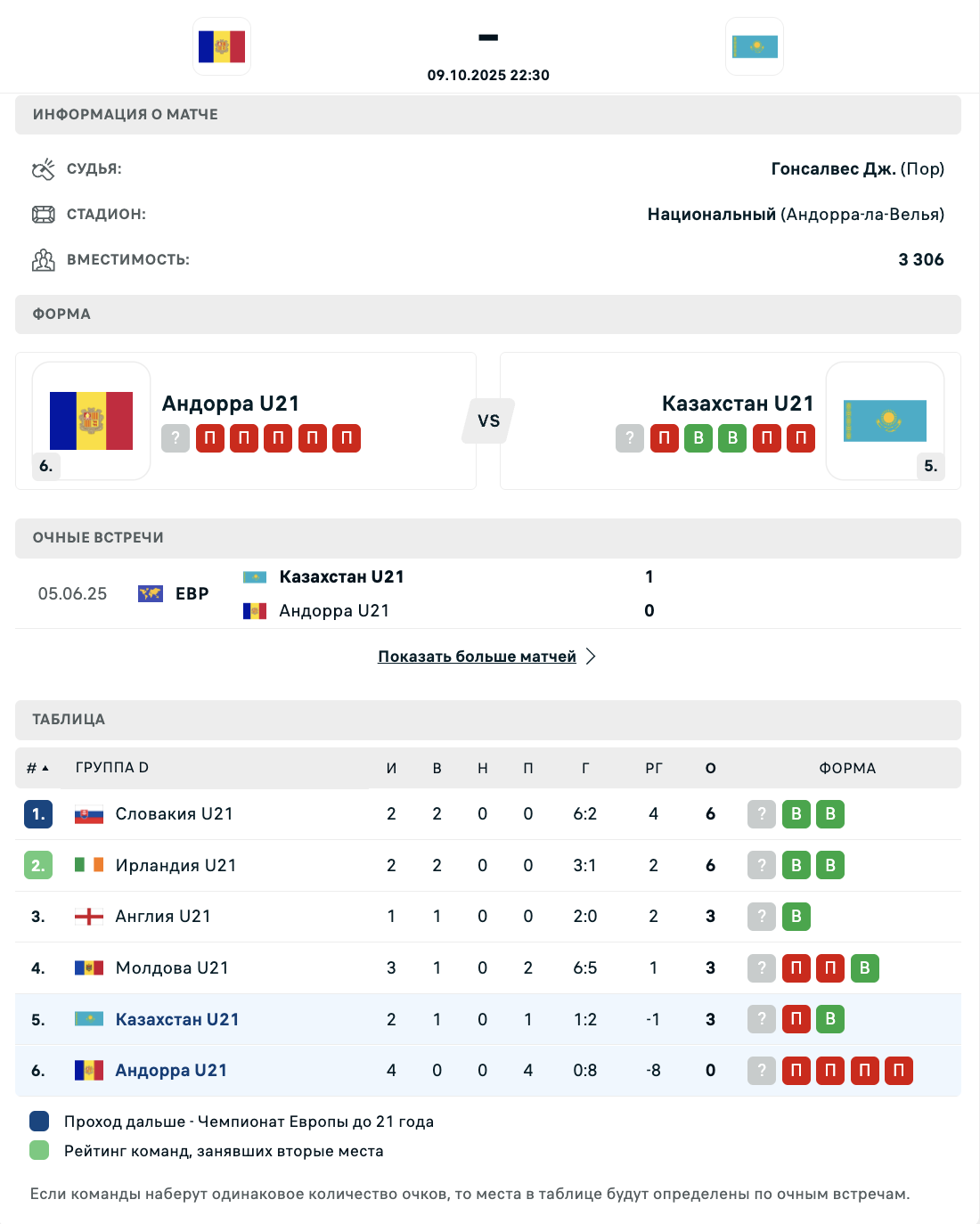 - ❌ 05.09.2025: Словакия U-21 – Андорра U-21 3:0 (отбор)