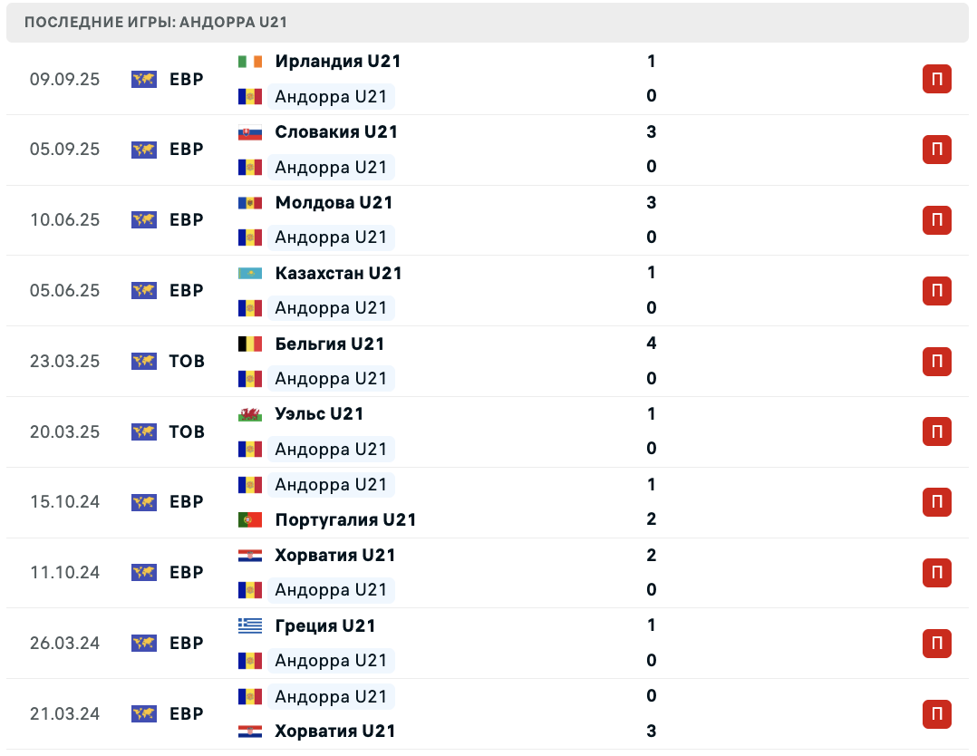 - ❌ 09.09.2025: Ирландия U-21 – Андорра U-21 1:0 (отбор)