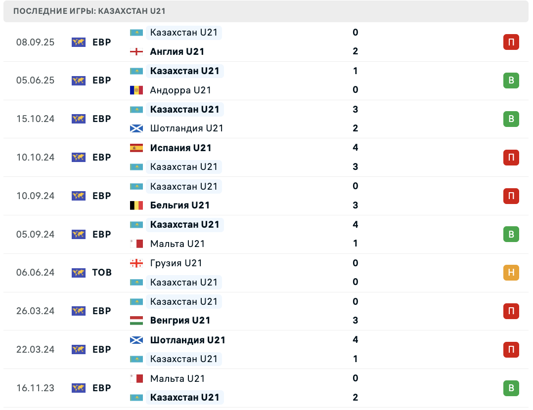 - ❌ 08.09.2025: Казахстан U-21 – Англия U-21 0:2 (отбор)