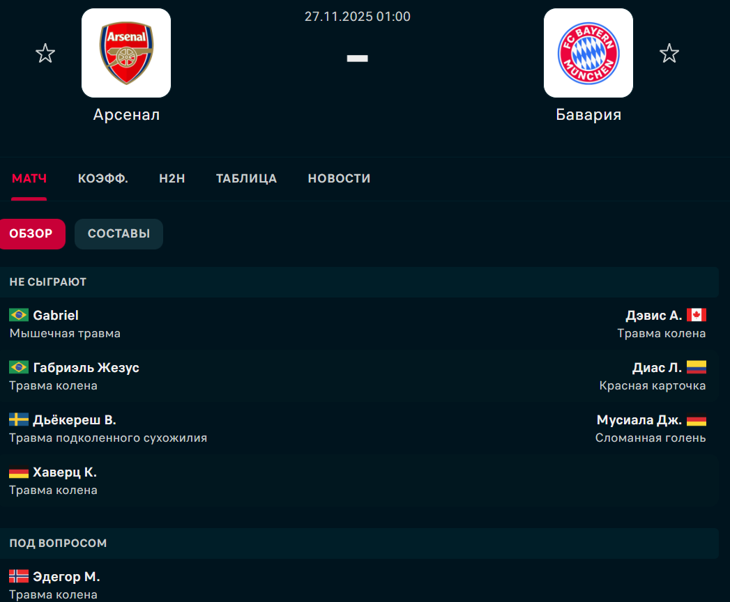"Бавария" также лидирует в чемпионате с отрывом в шесть очков. Клуб не проиграл ни разу в чемпионате и Лиге чемпионов, лишь раз потеряв очки. Предстоящее противостояние называют "скрытым" финалом. Обе команды подходят к встрече лишь с ограниченными потерями. "Канониры" не смогут рассчитывать на Габриеля, Дьекериша, Габриэля Жезуса, Хаверца и Эдегора. У "Баварии" точно не сыграют Дэвис, Диас и Мусиала.