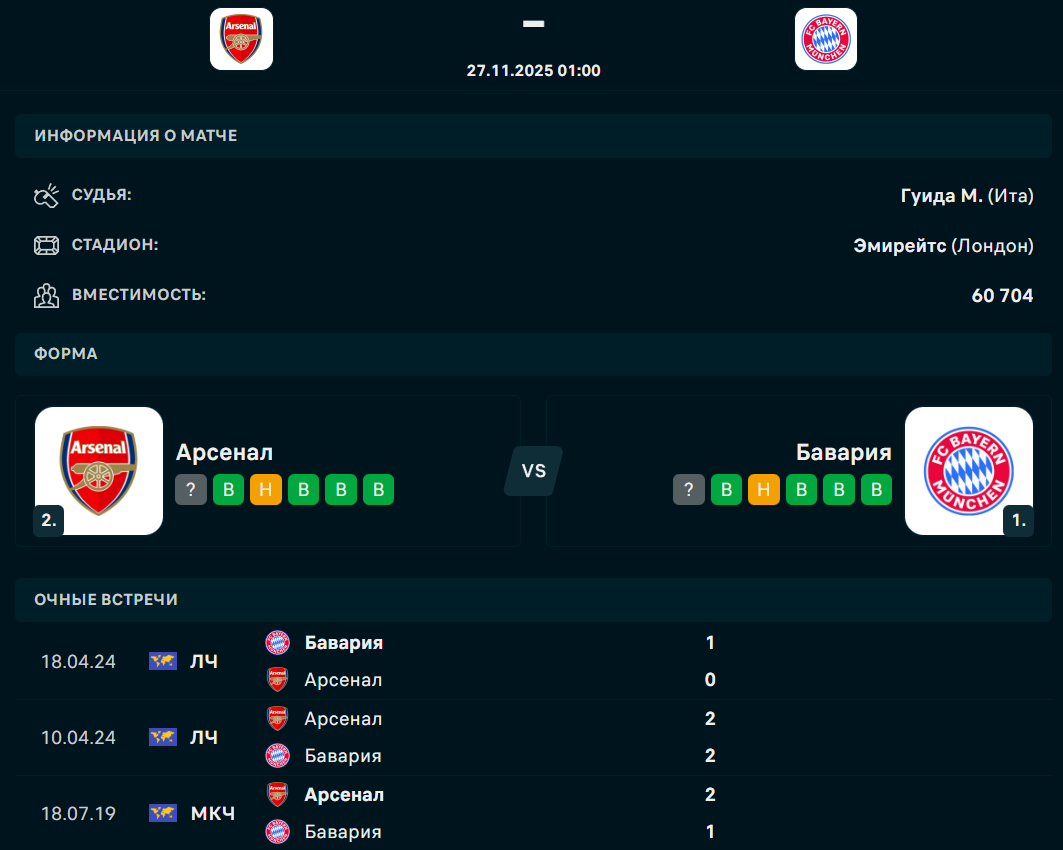 27 ноября состоится матч 5-го тура общего этапа Лиги чемпионов, в котором встретятся лондонский "Арсенал" и мюнхенская "Бавария", сообщает Спорт Шредингера.