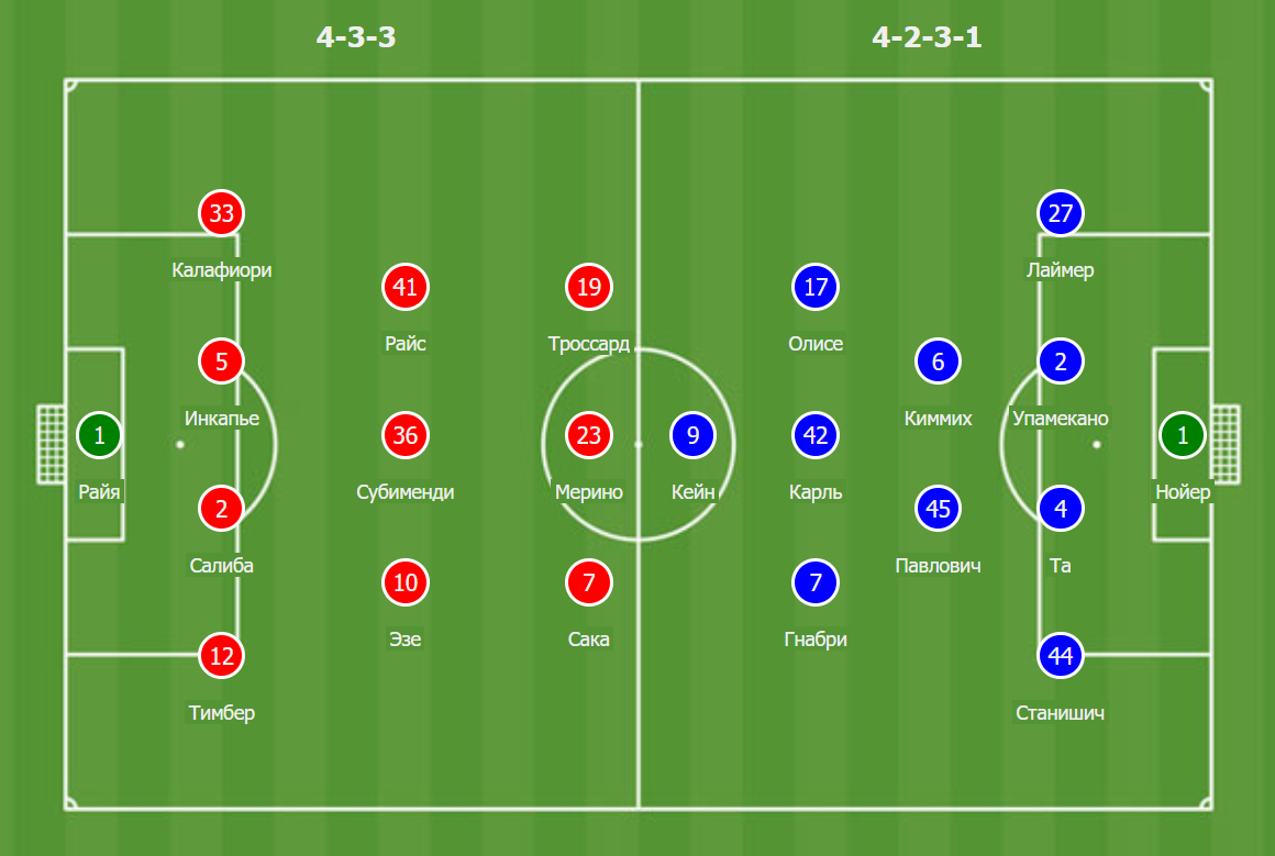 "Арсенал": Райя, Калафиори, Инкапье, Салиба, Тимбер, Райс, Субименди, Эзе, Троссард, Мерино, Сака.