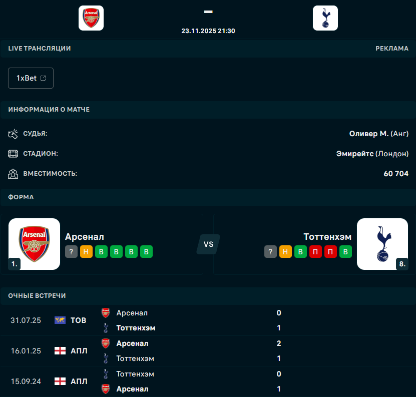 23 ноября состоится матч 12-го тура английской премьер-лиги, в котором встретятся лондонские "Арсенал" и "Тоттенхэм", сообщает Спорт Шредингера.