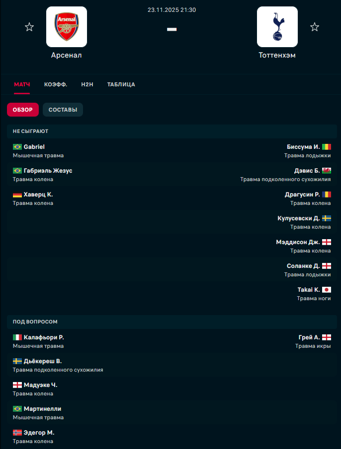 У "Арсенала" травмированы Габриэль дос Сантос, Габриэл Мартинелли, Габриэл Жезус, Нони Мадуэке, Мартин Эдегор, Кай Хаверц, Виктор Дьёкереш. У "Тоттенхэма" травмированы Ив Биссума, Деян Кулушевски, Джеймс Мэддисон, Доминик Соланке; под вопросом Арчи Грэй, Бен Дэвис, Раду Дрэгушин, Кота Такаи.