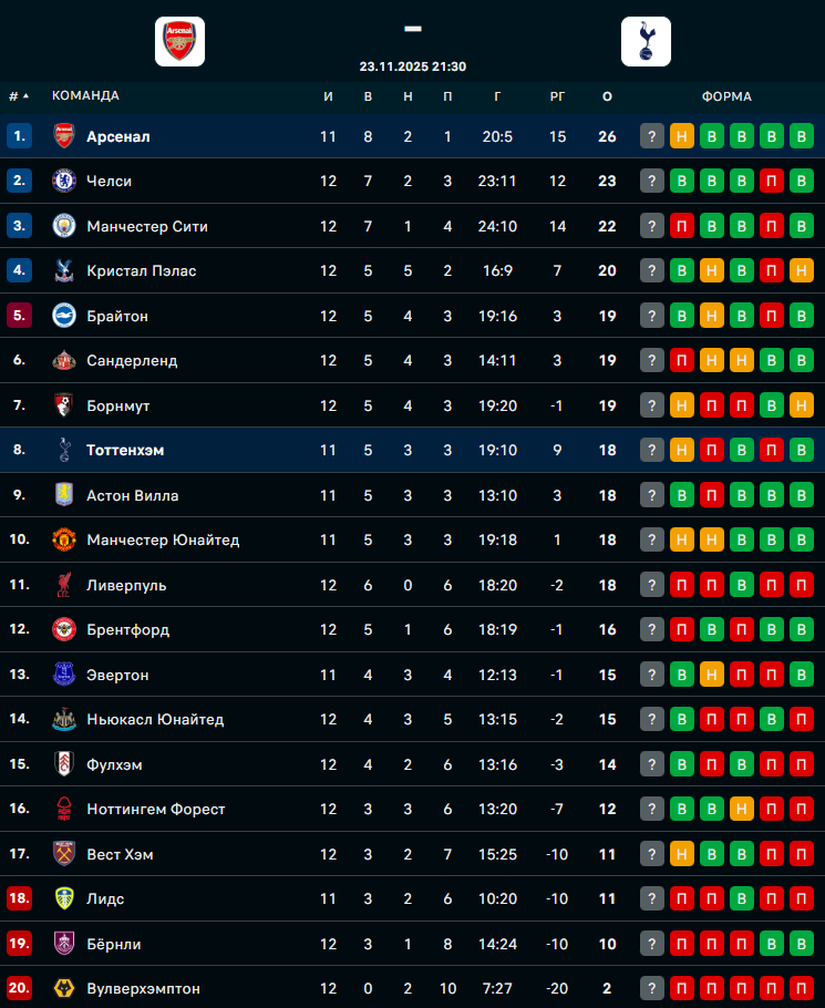 После 11 матчей чемпионата Англии "Арсенал" набрал 26 очков и занимает первое место. "Тоттенхем" заработали 18 баллов и располагаются на восьмой строчке.