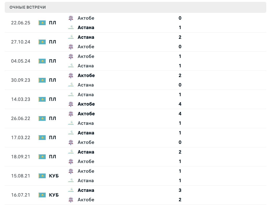 - 17.08.2025. "Актобе" - "Окжетпес" - 2:1 (победа, дома)