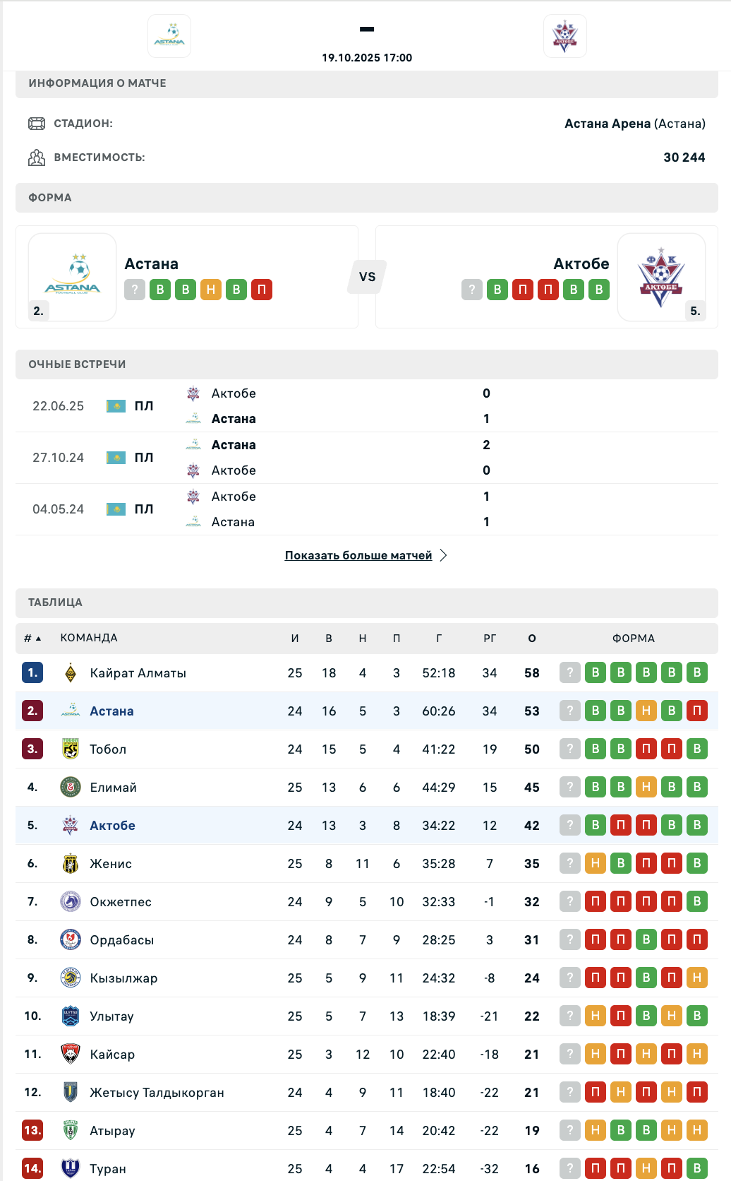 "Актобе" перед визитом в столицу идет на 5-м месте с 42 очками после 24 матчей (разница мячей 34–22), но по потерянным очкам и дополнительным показателям в случае победы может снова обойти семейский "Елимай" (45 очка, но на матч больше).