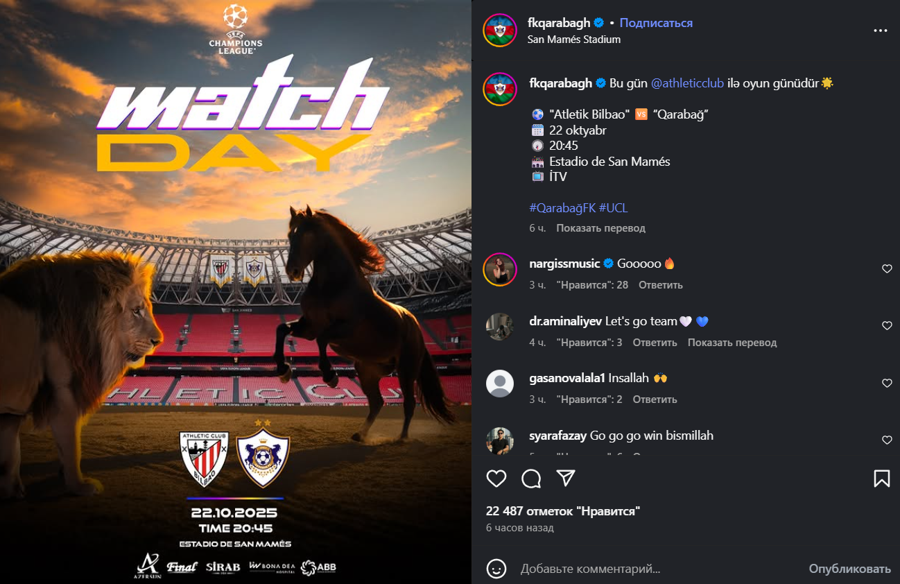 Прямая трансляция матча "Атлетик" - "Карабах" в Лиге чемпионов