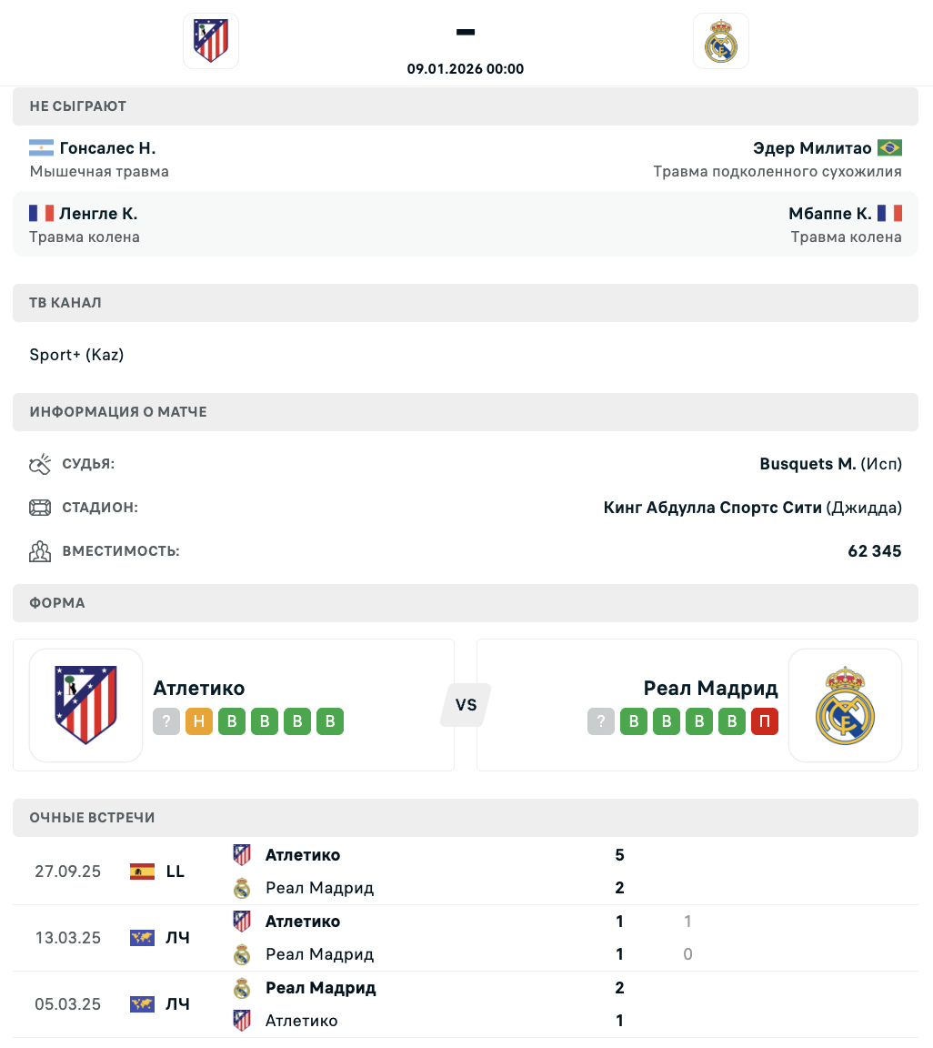 9 января в 00:00 мадридские "Атлетико" и "Реал" встретятся в полуфинале Суперкубка Испании, сообщает Спорт Шредингера.