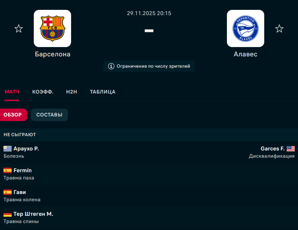 Кадровых потерь у "Алавеса" нет, кроме дисквалифицированного Гарсеса, но "Барселона" точно не сможет рассчитывать на Тер Штегена, Фермина, Гави и Аруахо.