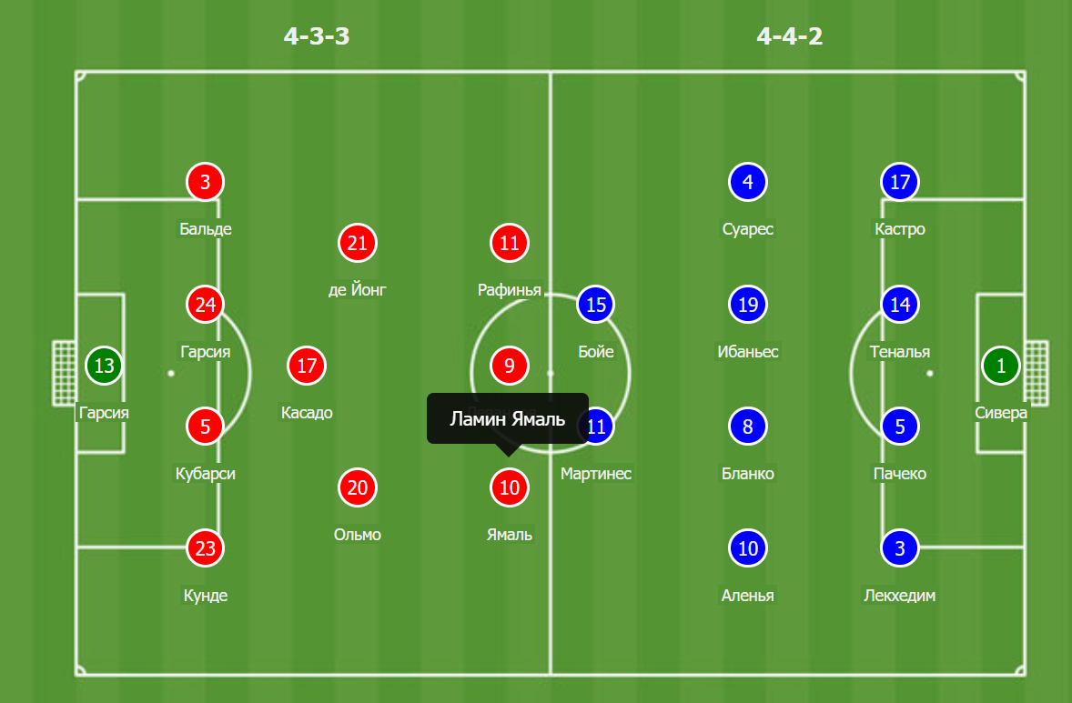 "Барселона": Гарсия, Бальде, Гарсия, Кубарси, Кунде, Касадо, де Йонг, Ольмо, Рафинья, Левандовски, Ямаль