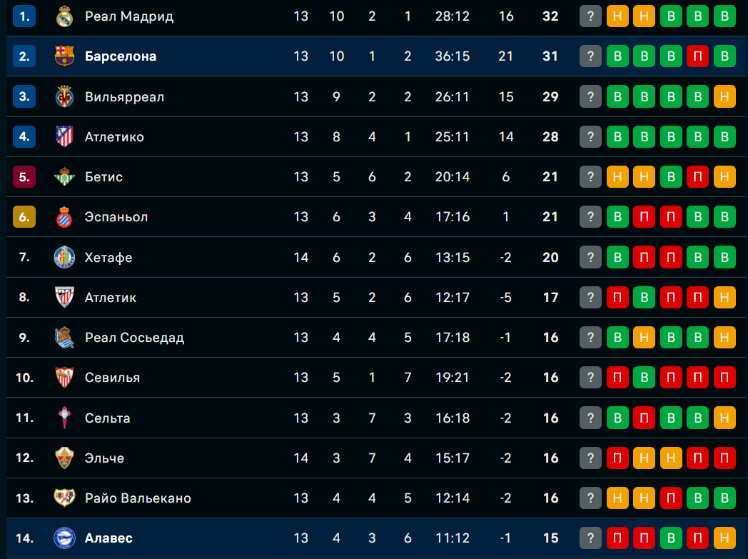 "Барселона" идёт второй, отставая от "Реала" на одно очко, а "Алавес" располагается на 14-м месте, отрываясь от зоны вылета на четыре балла.