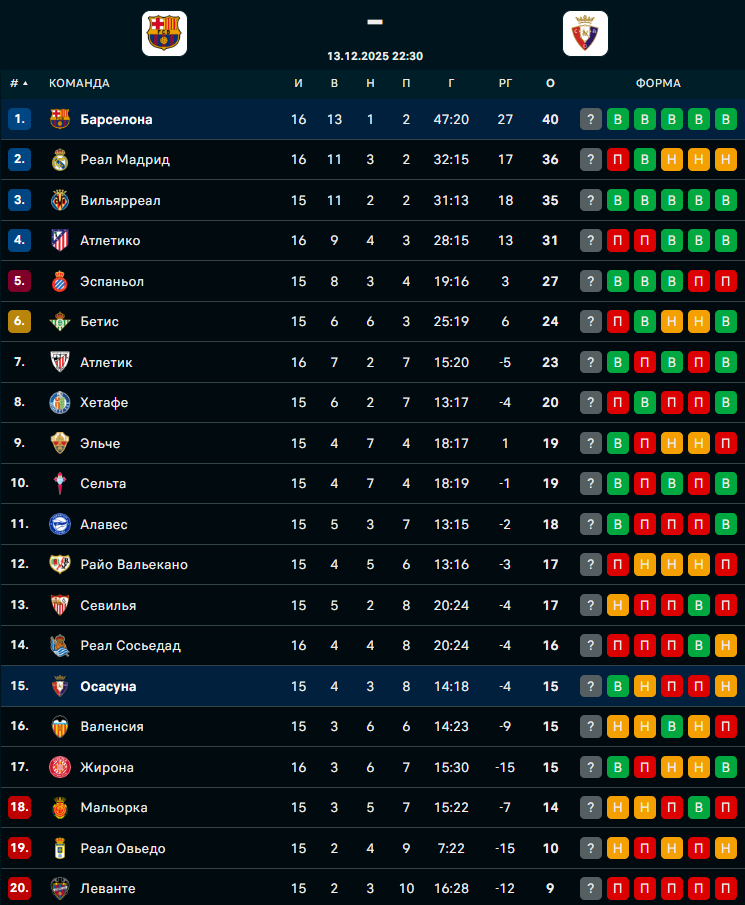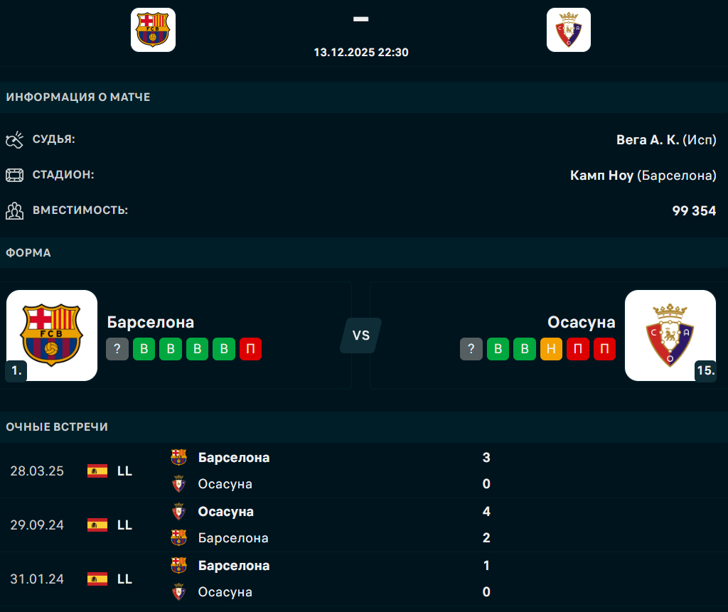 "Барселона" лидирует в Примере, оторвавшись от "Реала" на четыре очка. "Осасуна" на 15-м месте, отрываясь от зоны вылета на три балла. Каталонцы после поражения от "Реала" в Испании не проигрывают.