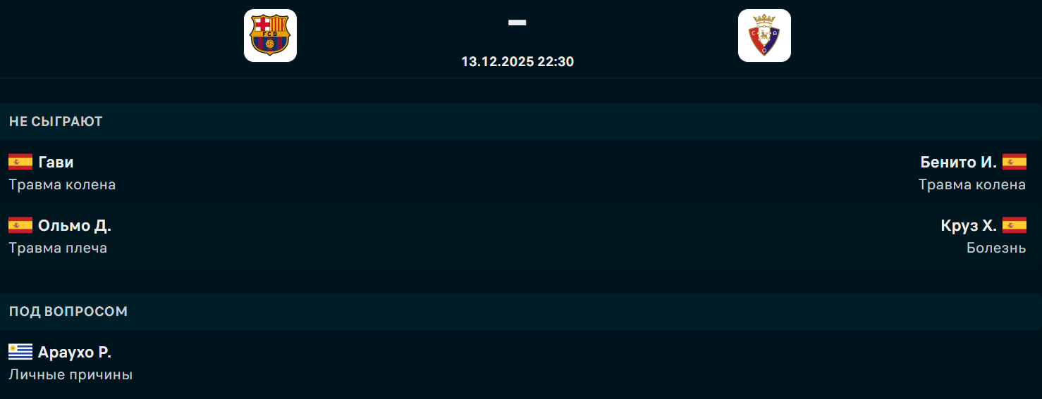 "Барселона" из-за различных проблем не сможет рассчитывать на Гави, Ольмо и Аруахо. У "Осасуны" точно не сыграют Бенито и Круз.