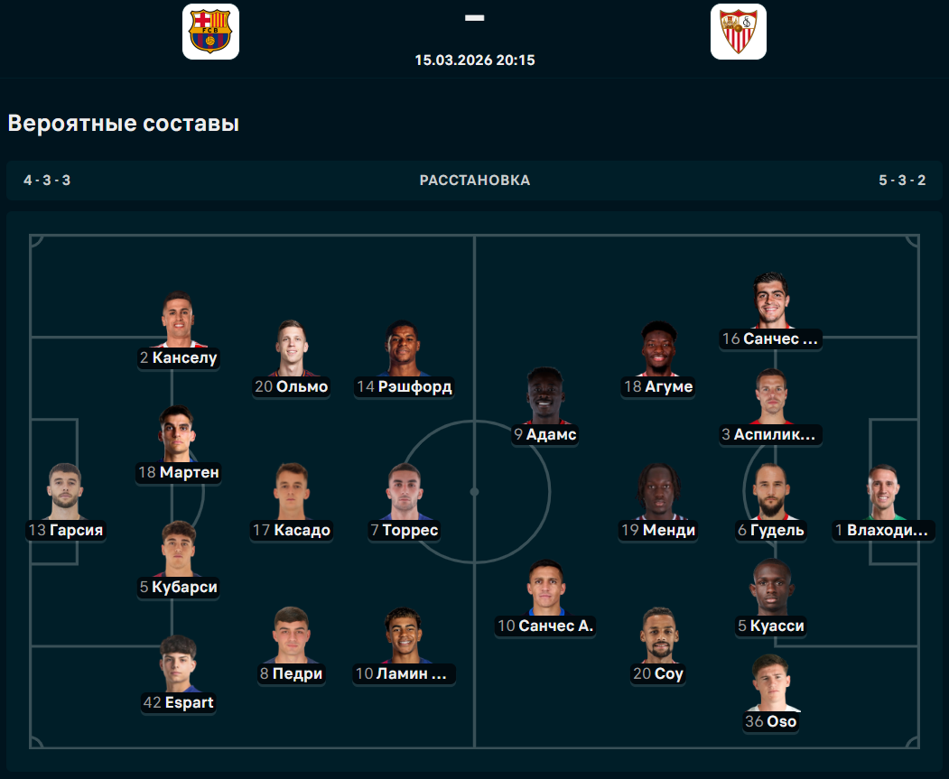 У "Барселоны" из-за травм не сыграют Бальде, Кристиансен, Кунде и Де Йонг. В составе "Севильи", по состоянию здоровья на поле не выйдут Пеке, Маркан и Салас.