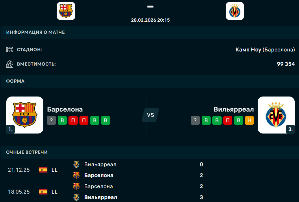 "Барселона" одержал четыре победы и один раз проиграла в пяти последних встречах. У "Вильярреала" три победы, одна ничья и одно поражение в пяти матчах.