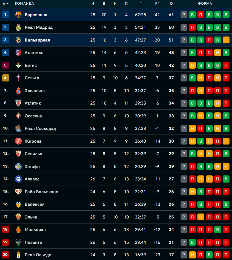 "Вильярреал" набрал 51 очко после 25 матчей. Команда одержала 16 побед, три раза сыграла вничью и потерпела шесть поражений.
