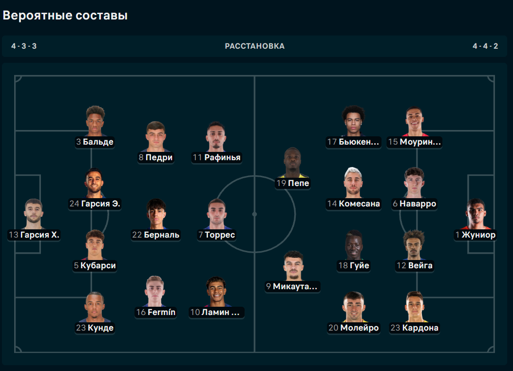 У "Барселоны" точно не сыграют Кристиансен, Мартин и Де Йонг. У "желтых" кадровые проблемы сложнее. На поле точно не выйдут Кабаньес, Коста, Фойт, Камбвала и Морено. Ниже публикуются ориентировочные составы.
